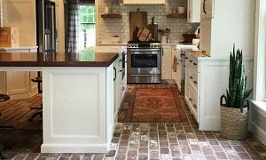 ניתן לייצר ריצוף ויניל כדי להידמות באופן הדוק לכל אחד מכמה חומרים טבעיים. במטבח זה הרצפה מורכבת מוויניל גיליונות המודפס עם תמונות של קרשים מעץ קשה. לעץ הדמוי גוון זהוב עשיר המשתלב בצורה נעימה עם הארונות הלבנים וריהוט העץ הקשה בחלל. הריצוף משלב את המשיכה החזותית של הפרקט עם העמידות והתחזוקה הקלה של הוויניל.