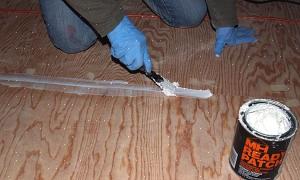 מרחו שכבה של דבק אריחים דק-דק על הוויניל, בעזרת כף מחורצת. לשם כך יש לזרוק כמות קטנה של דבק דק-דק על הרצפה ואז לגרור את קצה הכף על מנת לכסות את הרצפה. אזורים חשופים בין רכסי הדבק צריכים לחשוף את ריצוף הוויניל. רכסים אלה ישתטחו וימלאו פערים כאשר לוח לוחות המלט נלחצים על גבי הדבק.