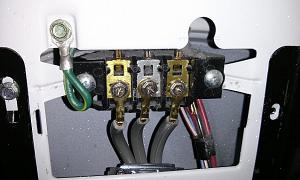 במקרה זה, הפיתרון הוא החלפת כבל 3-שיניים ישן בכבל 4 שיניים שיתאים לשקע החדש.נתק את כבל 3-שיניים הישן על ידי הסרת שלושת הברגים המחברים את קצות התיל לגוש המסוף של המייבש. שני המסופים החיצוניים הם המסופים החמים, והמסוף המרכזי הוא הנייטרלי. יכול להיות שיש חוט לבן קצר או רצועת מתכת המצטרפים למסוף הנייטרלי ולבורג הארקה, או שיש חוט לבן שמגיע מתוך המייבש ומתחבר לבורג הארקה. זוהי תצורת 3 החוטים שקושרת את קרקע המארז לחוט הכבל הנייטרלי. משוך את הכבל החוצה דרך החור כדי להסיר אותו מהמייבש.